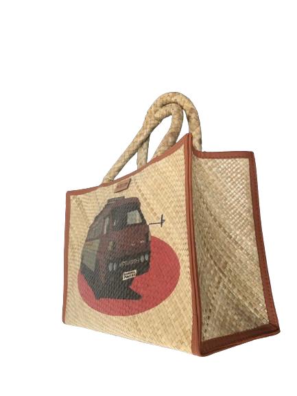 This bag is the result of a decoupage creation with a unique motif that comes from patterned tissue on woven pandanus media. Our innovation in this bag is to use tissue with the motif of Bangka Belitung's local wisdom, namely Pownis local transportation. This bag has a large size with a zipper. Stock is available and can be ordered in large quantities with a PO system. And also can be costum for the motif.