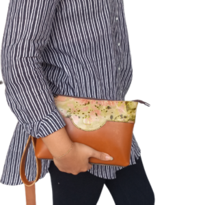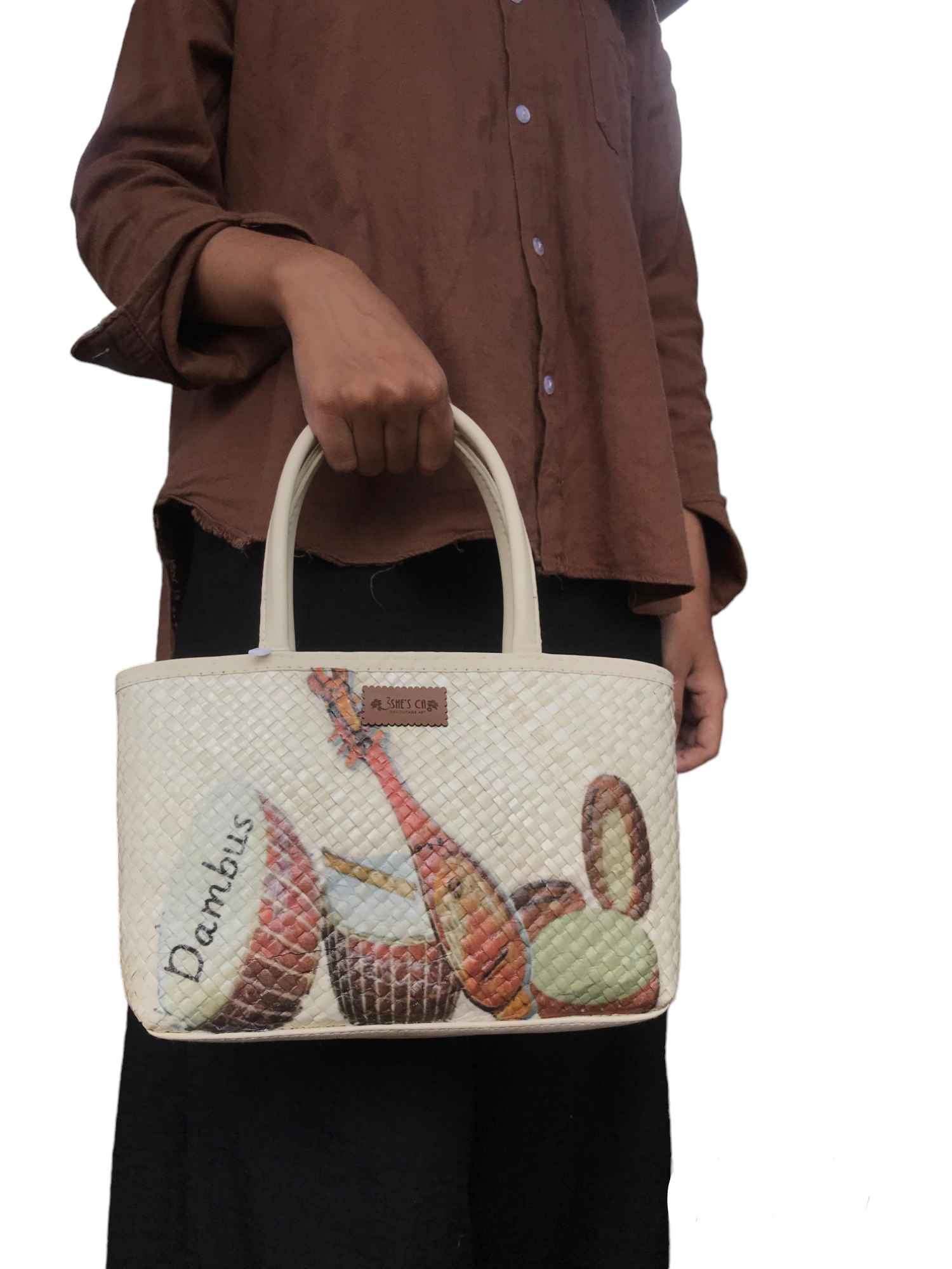 This bag is the result of a decoupage creation with a unique motif that comes from patterned tissue on woven pandanus media. Our innovation in this bag is to use tissue with the motif of Bangka Belitung local wisdom, namely the dambus musical instrument. This bag has a small size and has a zipper. Stock is available and can be ordered in large quantities with a PO system. And can also costum for the motif.