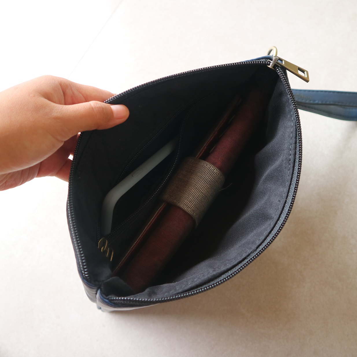 Made from ikat woven material, premium faux leather, cotton inner, black nickel accessories, zipper.