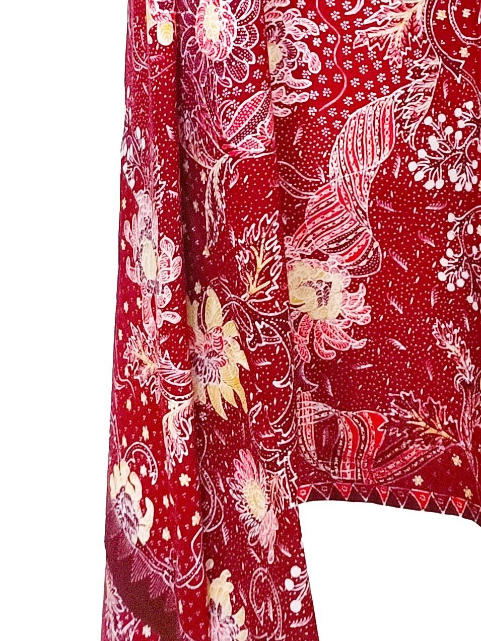 Pattern Meaning: Bunga peony memiliki simbolisme budaya yang signifikan. Bunga ini dipuja sebagai simbol cinta, romansa, dan kemakmuran. Bunga peony merah melambangkan rasa hormat, kehormatan, dan kekayaan. Bunga ini juga dianggap sebagai tanda keberuntungan dan kemakmuran. Peony kuning, biasanya melambangkan kebahagiaan, perayaan, dan kegembiraan. Sedangkan Parijoto adalah jenis tanaman/buah yang banyak ditemukan di Desa Colo, Kabupaten Kudus. Buah ini punya banyak peran bagi masyarakat, mitosnya jika ibu hamil makan buah ini, maka akan melahirkan anak yang tampan atau cantik.