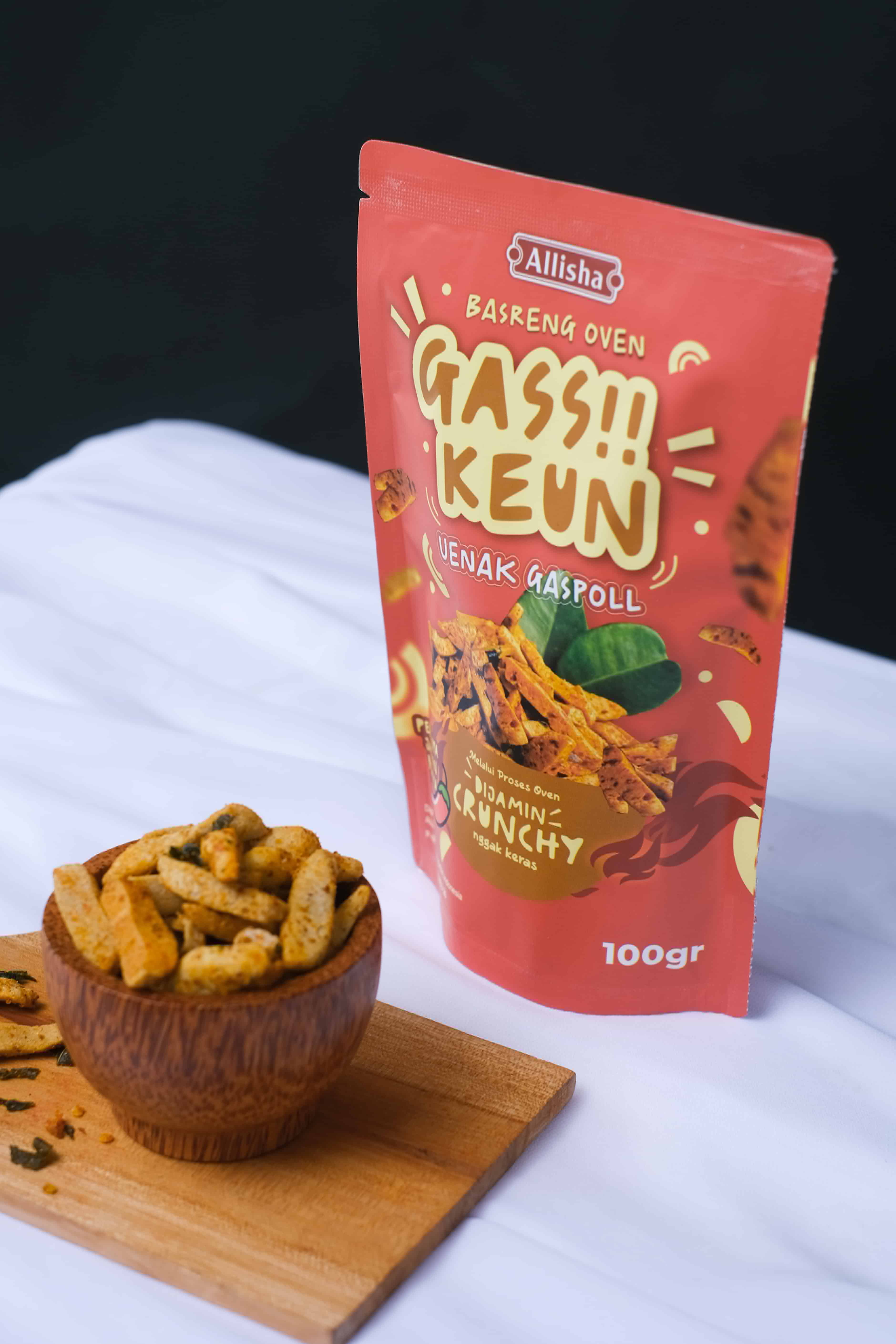 Basreng Oven Gasskeun Allisha is a snack made from fish meatballs. Processed in the oven to produce basreng that is more hygienic, low in calories and more crunchy. There are 2 Flavors original onion and the spicy taste of lime leaves. Basreng Oven Gasskeun Allisha packed in a standing pouch. Very suitable for snacking friends at leisure.