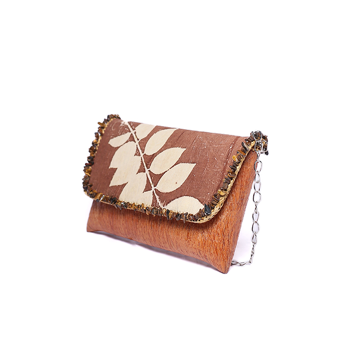 Made from kapuak bark fiber which is a typical Kalimantan local wisdom material combined with ecoprin fabric whose motifs are produced from fresh leaves. motifs are produced from fresh leaves.