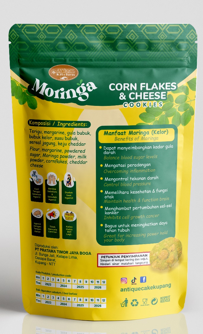 Material Content: terigu, margarine, gula bubuk, bubuk kelor ( moringa ), susu bubuk, corn flakes, keju cheddar