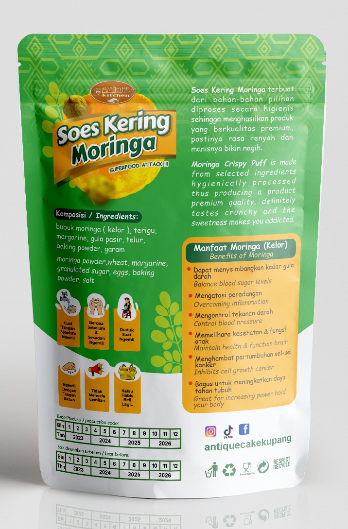 super crunchy, light soes, mixed between savory and with chocolate filling that melts on the tongue. and also moringa powder gives a unique taste to this moringa dry soes. With a special technique, it produces a dry soes texture that is crunchy, hollow and also light. This snack that children really like can be taken anywhere and also served as a daily snack