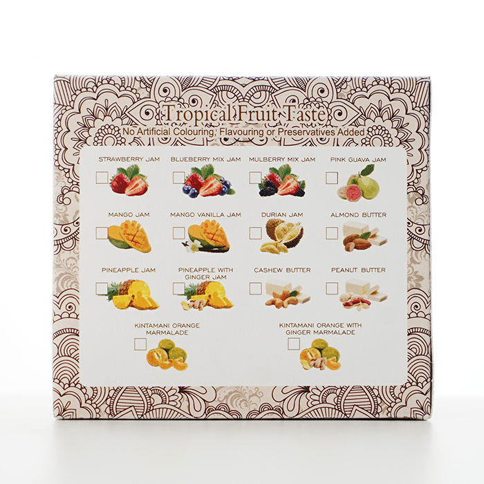 Experience the BTR Gift Box of 2, featuring Mulberry Mix Jam and Mango Vanilla Jam. Indulge in the unique flavors of mulberry and strawberry, and the tropical fusion of mango and vanilla. Adorned with a Balinese design, it's the perfect gift for any occasion. Embrace the taste of Bali today!