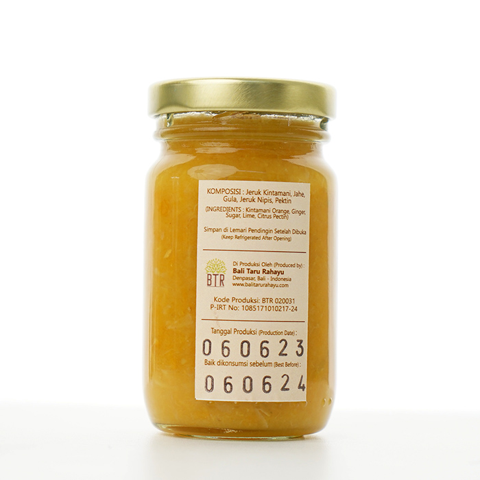 BTR Kintamani Orange with Ginger Marmalade is a delightful combination of Kintamani orange marmalade infused with the warmth of ginger. Experience the refreshing taste of Kintamani oranges harmoniously blended with the delightful and invigorating essence of ginger. Perfect for spreading on toast or pastries, or as an addition to your favorite dishes. BTR Kintamani Orange with Ginger Marmalade will provide a special sensation with every bite. Taste the harmony of flavors and enjoy the tropical goodness it brings.