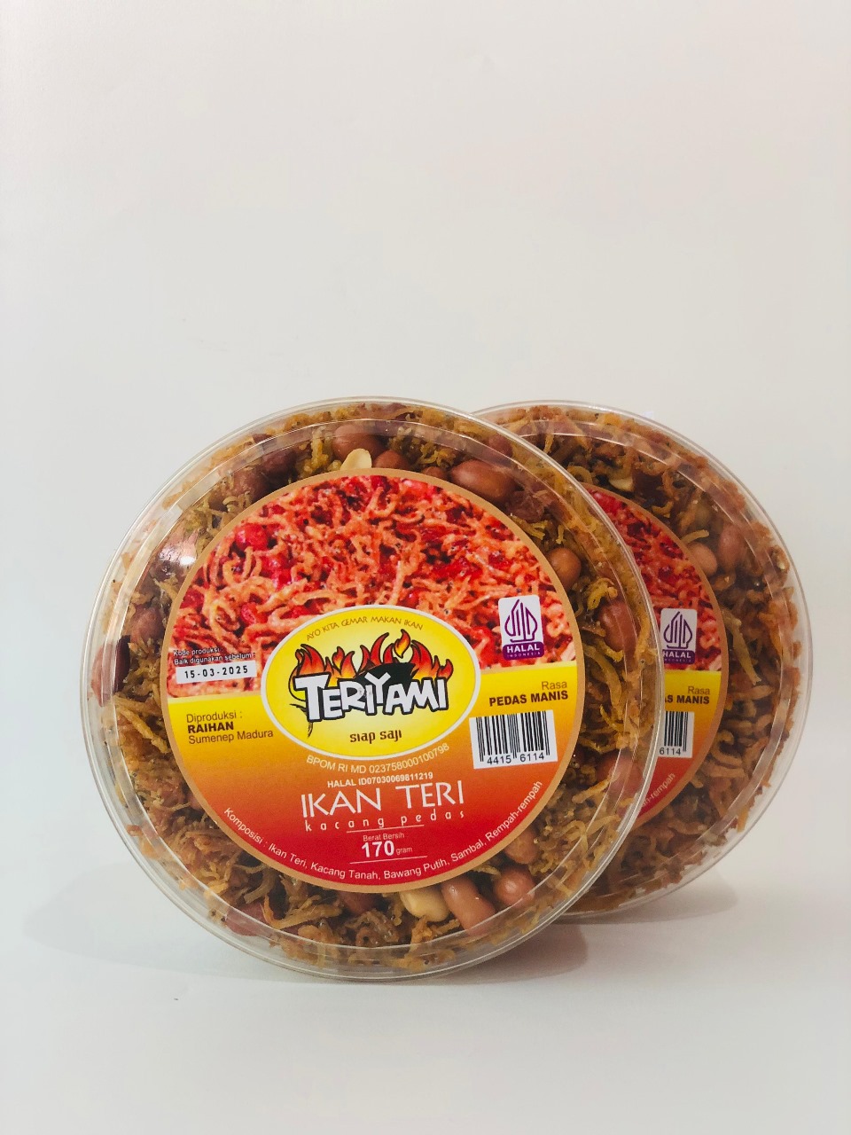 Teriyami Ikan Teri Kacang Pedas is a savory and spicy snack made with selected fresh anchovies and crunchy peanuts. The anchovies are marinated in a special teriyaki sauce and fried to perfection, resulting in a perfectly infused savory and sweet flavor. The sprinkled peanuts add a crunchy texture and a spicy kick that awakens the taste buds.