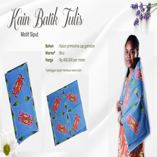 In Papua traditional language (Sentanese), Phokouw means spring and Faa means child. Phokouw Faa Boutique was founded in 2009. Phokouw Faa Boutique produces stamped and hand-drawn batik with various motifs originated from Sentani Region. Some of the motifs were snail motifs, turtle motifs, butterflies, birds of paradise (Cendrawasih), fish tails (Yonik), and various other motifs. Apart from producing batik, Phokouw Faa Boutique also organize batik training for anyone who wants to learn.