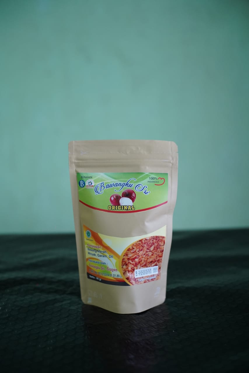 ABMI is located at Dukuhan RT 01/ RW 04, Nglorog, Sragen Regency. ABMI is a forum for shallot producers to encourage Sragen Shallot farming to be more environmentally friendly with cost efficiency and improve product quality. ABMI Sragen cooperates with its members to facilitate the production and processing of shallots from upstream to downstream. Since 2017, the BawangkuSri brand has been developed, which prioritizes the quality of pure fried onions without flour. Processed properly, the aroma of shallots is still strong with a sweet, savory taste for meals and snacks.