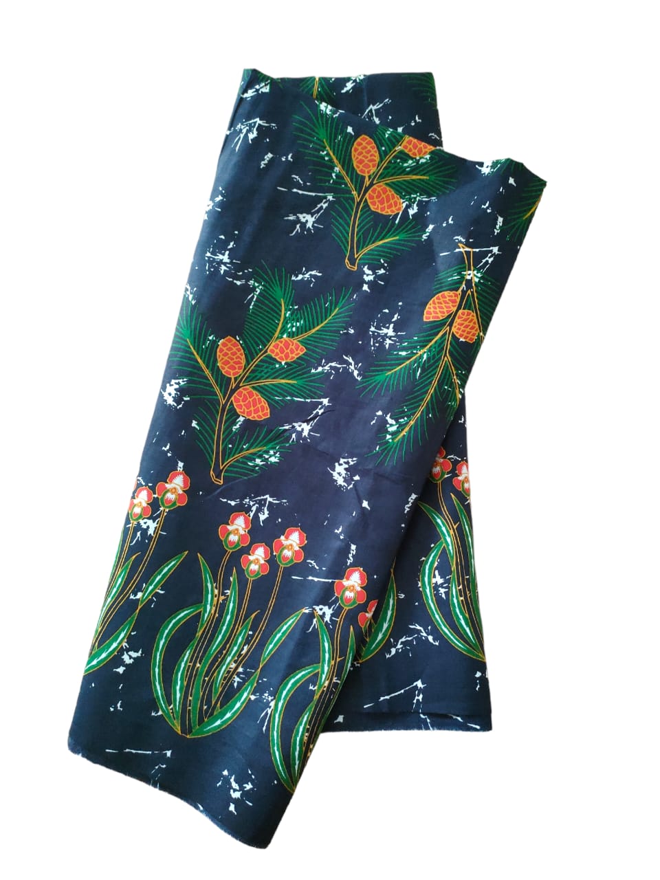 Pattern Meaning: Buah ru disebut juga cemara laut umumnya ditemukan di wilayah tepi pantai Pulau Belitung. Ranting pohonnya berbentuk seperti jarum dengan panjang dapat mencapai sekitar 30cm. Daun cemara juga memiliki bintik seperti sisik dan tersusun melingkar dengan jumlah 6-10 helai. Pada saat berbuah, akan mendapati buahnya berbentuk kerucut bulat memanjang dan di dalamnya terdapat banyak biji bersayap. Motif ini menggunakan tumpal motif anggrek bulan. Daunnya berwarna hijau dengan bentuk memanjang. Bunganya memilik sedikit keharuman dan waktu mekar yang lama serta dapat utmbuh hingga diameter 10 cm lebih. (The fruit "ru" is also known as "cemara laut" and is commonly found in coastal areas of Belitung Island. Its tree branches are needle-like, reaching a length of approximately 30cm. The leaves of the "cemara" also have scale-like spots and are arranged in a circular pattern with 6-10 pieces. When it bears fruit, the fruit takes on a long, conical shape with many winged seeds inside. This motif uses the "tumpal" motif of the moon orchid. Its leaves are green and elongated, while the flowers have a slight fragrance, long blooming time, and can grow up to a diameter of more than 10 cm)