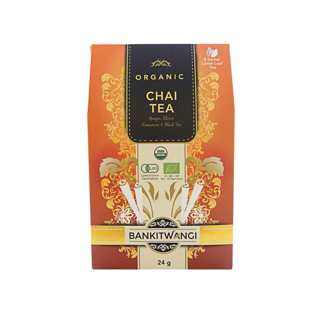 Chai Tea is a type of blended tea that is well-loved in various parts of the world. It is a strong-flavored tea with pleasant stimulation that uses a variety of spices including ginger, cloves, and cinnamon blended with premium black tea. You can enjoy this tea either by drinking it unsweetened and straight, or by brewing it strong with a longer steeping time and adding milk and sugar. (Chai Tea adalah jenis teh campuran yang sangat disukai di berbagai belahan dunia. Teh dengan rasa yang kuat dengan rangsangan menyenangkan yang menggunakan berbagai rempah-rempah termasuk jahe, cengkeh, dan kayu manis yang dicampurkan dengan teh hitam premium. Anda dapat menikmati teh ini baik dengan meminumnya tanpa pemanis dan langsung, atau dengan menyeduhnya kuat dengan waktu seduhan yang lebih lama dan menambahkan susu dan gula)