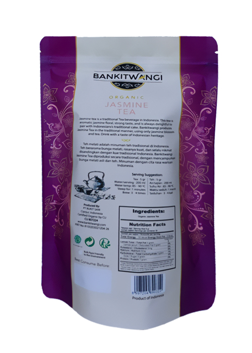 A traditional Indonesian drink is jasmine-flavored tea. A process that combines two different types of jasmine flowers with organic green tea is used in producing this tea. Bankitwangi continues to follow the traditional process method in making Jasmine Tea by using only jasmine bud flowers and organic green tea as its base without any other ingredients. Jasmine Tea has a beautiful scent of jasmine flowers and a natural aroma drawn from the jasmine flowers. (Minuman tradisional Indonesia adalah teh beraroma melati. Proses yang menggabungkan dua jenis bunga melati yang berbeda dengan teh hijau organik digunakan dalam memproduksi teh ini. Bankitwangi terus mengikuti metode proses tradisional dalam pembuatan Teh Melati dengan hanya menggunakan bunga melati kuncup dan teh hijau organik sebagai bahan dasarnya tanpa bahan lain. Jasmine Tea memiliki aroma bunga melati yang indah dan aroma alami yang diambil dari bunga melati)