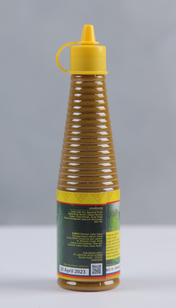 Capli Sambal Hijau is a chili sauce made from 60% green cayenne pepper from the Gayo highlands mixed with asam sunti (fermented star fruit wulu which functions as a thickener, acidifier, and preservative) to create a distinctive and unique spicy taste, without flavorings, sweeteners, and non-MSG can last up to 1 year. Already BPOM and Halal certified and MPU Aceh