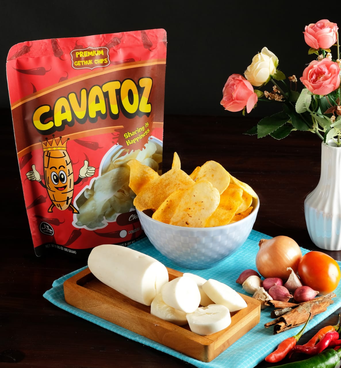 Gethuk/ steamed cassava chips topped with spicy seasoning. Cavatoz use spicy flavored seasoning that doesn't contain preservatives & artificial coloring... perfect for your and your family's snacks! Have a good snack no need to worry..
