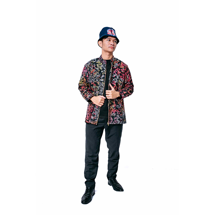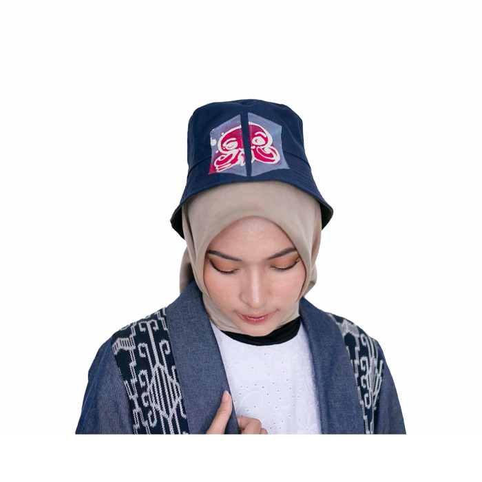The bucket hat is combined with patchwork batik cap sedau