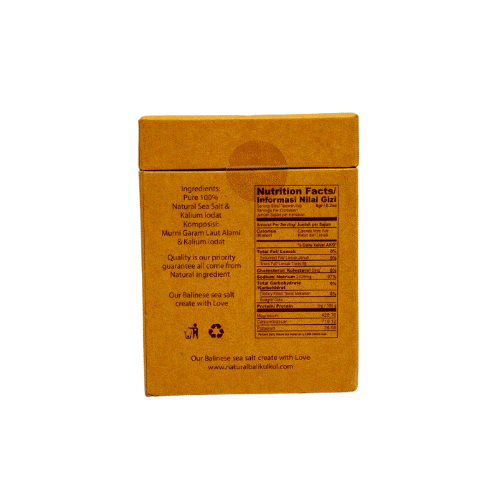 Natural Bali Kulkul Sea Salt is refined sea salt created by a result of the sea , wind and heat off coast of Bali. It is slowly drying into Green Glass House to keep the mineral Content inside. Crunch in the Mouth. Content of calcium, magnesium and potassium,