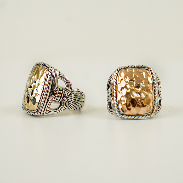 This design was inspired by a bundle of rope tied that was hit by the waves and irradiated by the sun so that an eroded texture was formed. The beauty of this ring also can be seen clearly from the front view which is decorated with 18k Hammer Rose Gold.