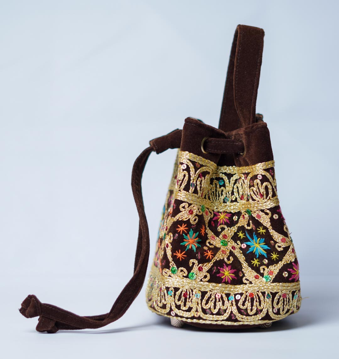 Angkinan embroidery, which is almost extinct, is moved to preserve the art of embroidery left by the Sriwijaya kingdom, this bucket bag model made of velvet embroidered with gold thread is here, giving a luxurious and unique impression with colorful cotton threads beautifully painted in floral motifs, or birds embroidered beautifully on this bag.