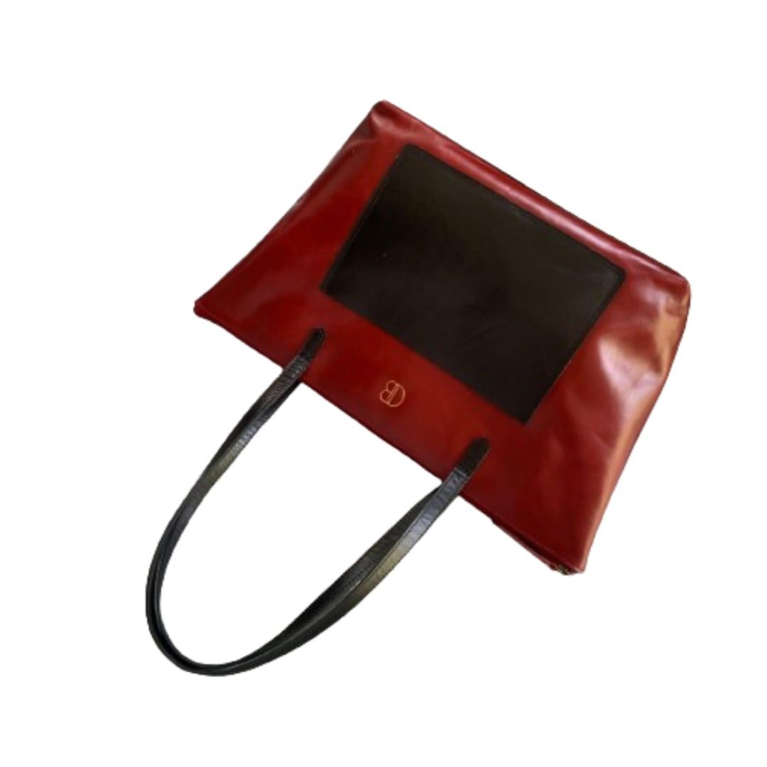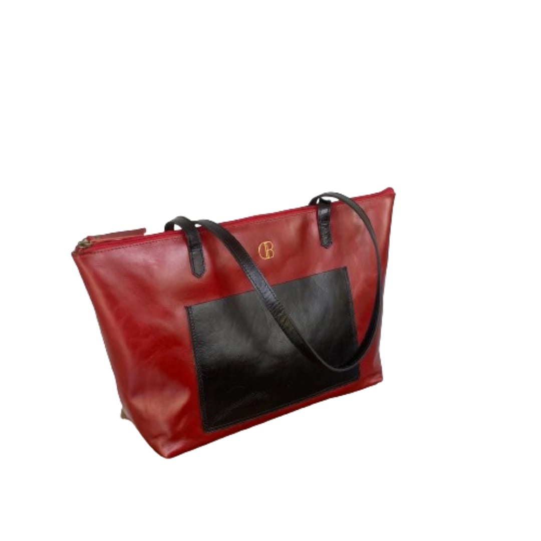 Material terbuat Kulit sapi asli jenis pullup dengan kombinasi warna antara hitam dan merah yang sangat chic dipakai untuk gaya casual atau formal, dengan ruang yang lega dan dapat memuat banyak barang