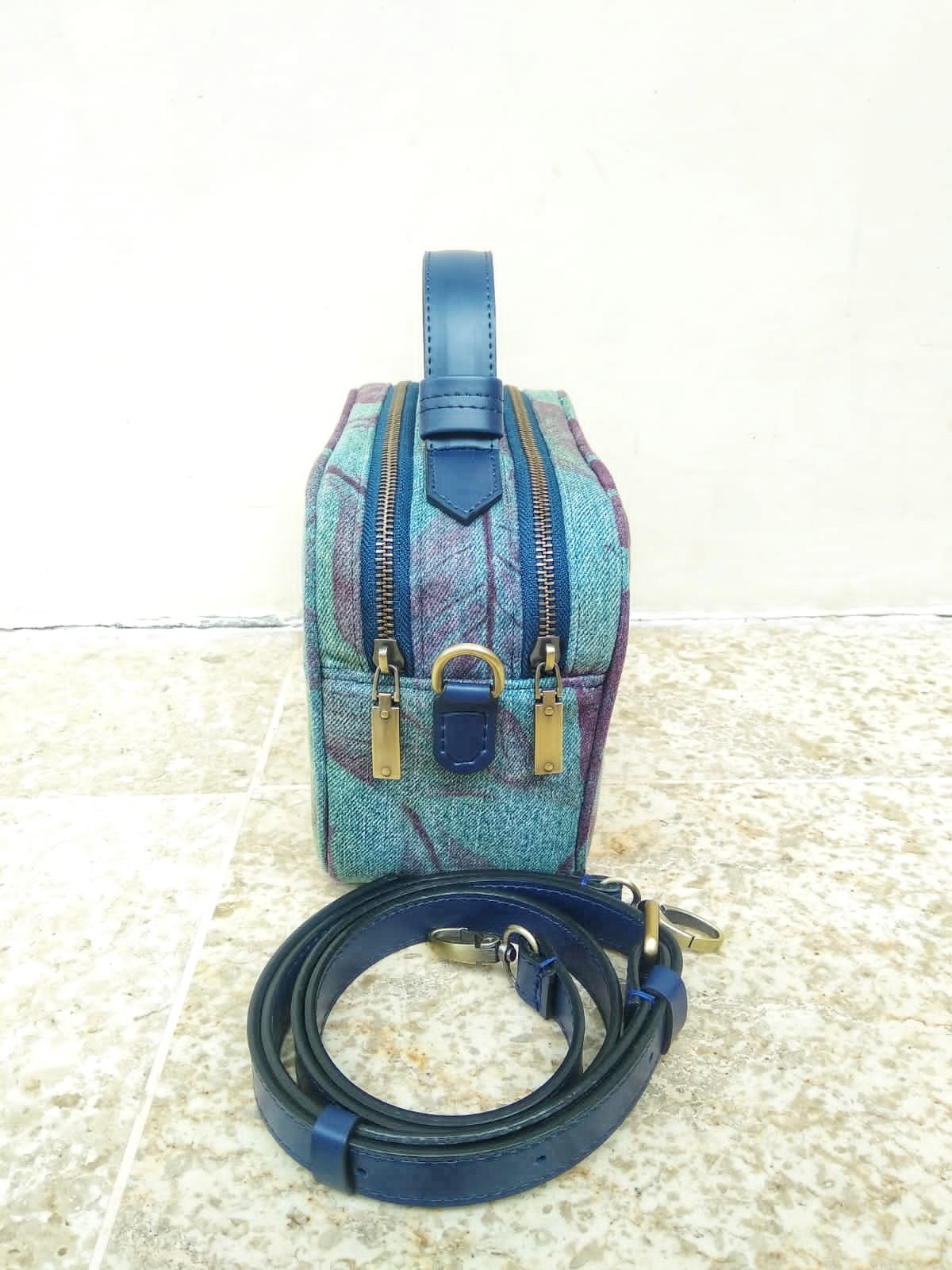 Tas wanita 2 rit berbahan jeans ori, dilengkapi tali panjang dan tapi tangan, bagian inner terdapat kantong serbaguna dan kantong resleting