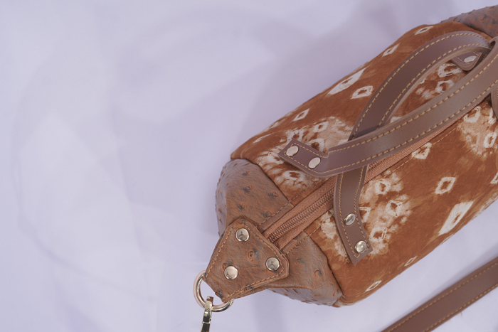 This stunning bag features a blend of natural dyed gambo jumputan fabric and premium synthetic leather, complete with an adjustable 130cm strap. Elevate your style with this unique and eco-friendly accessory!