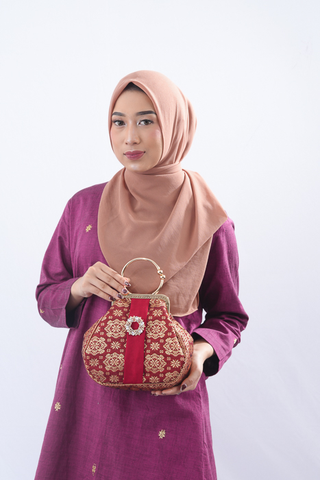An elegant party bag crafted from genuine Palembang songket fabric, featuring a 105 cm long chain.