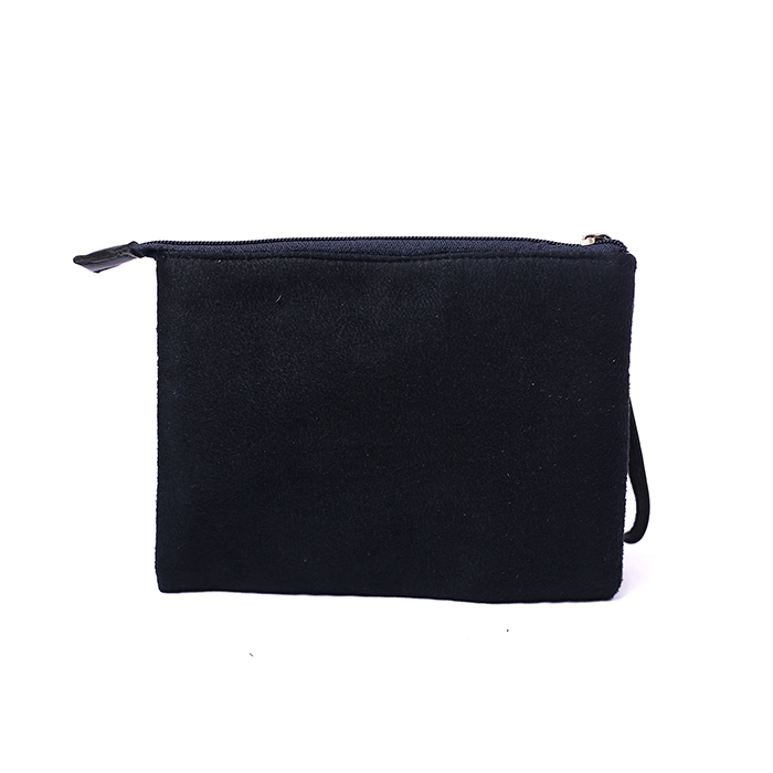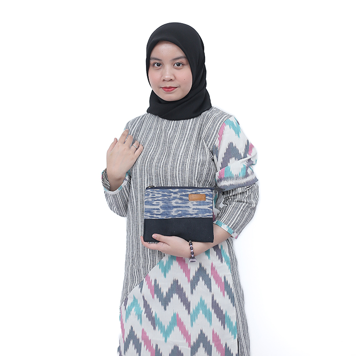 Simple pouch made of blue suede utilizing leftover pieces of ikat weaving fabric for shirt patterns, simple to use