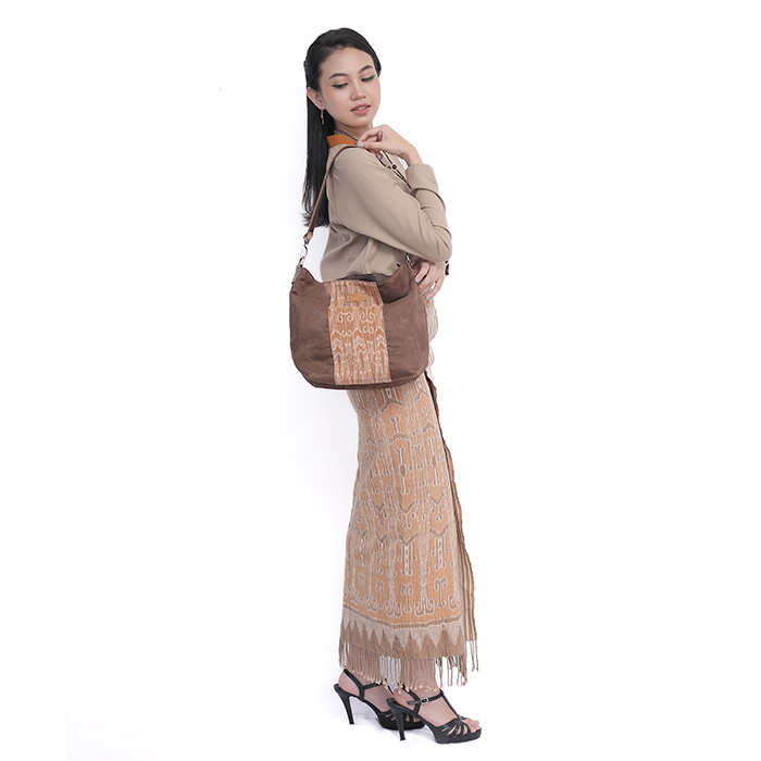 Simple handbag made of brown suede plus pieces of ikat woven fabric, great for traveling.