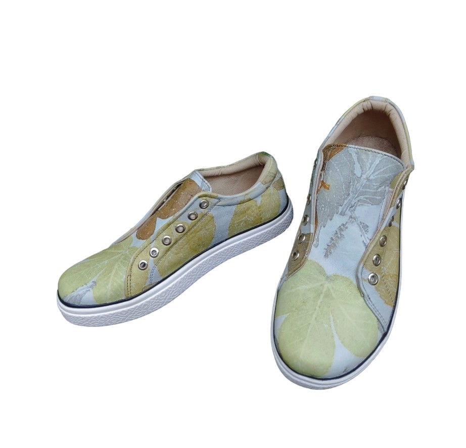Ecoprint sheepskin shoes made from sheepskin using natural dyes and original leaf motifs around us. Made from supple sheepskin to be comfortable when used and adjust the shape of the wearer's foot.