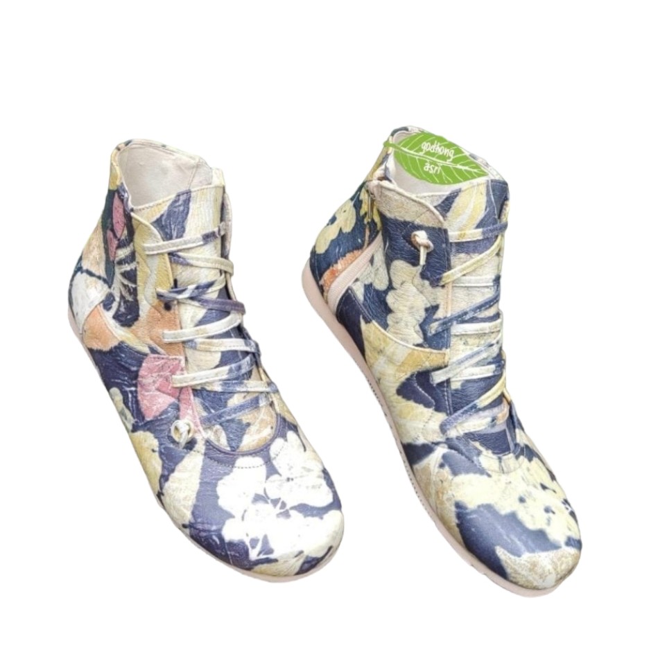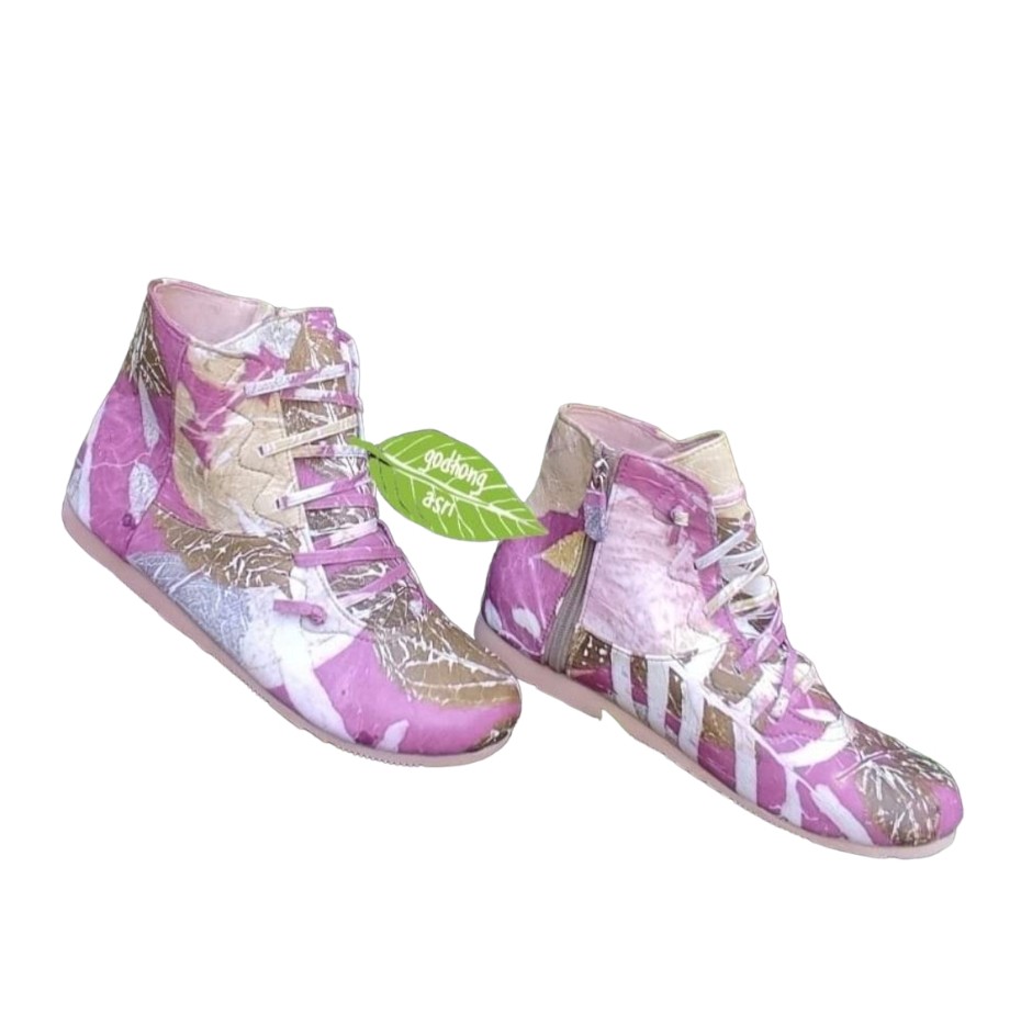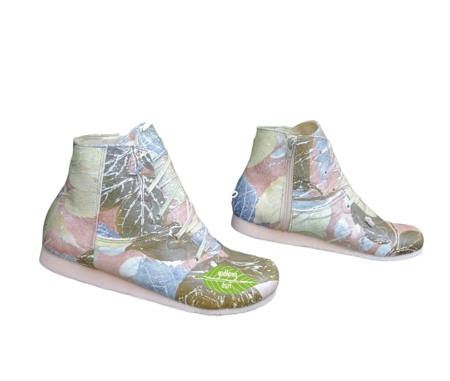 Boots made from ecoprint sheepskin. Made using natural dyes and original leaf motifs from around our home. Made from sheepskin because the texture of the leather is flexible so it is comfortable to use following the shape of the wearer's foot. Only made 1 pcs of each motif and color.