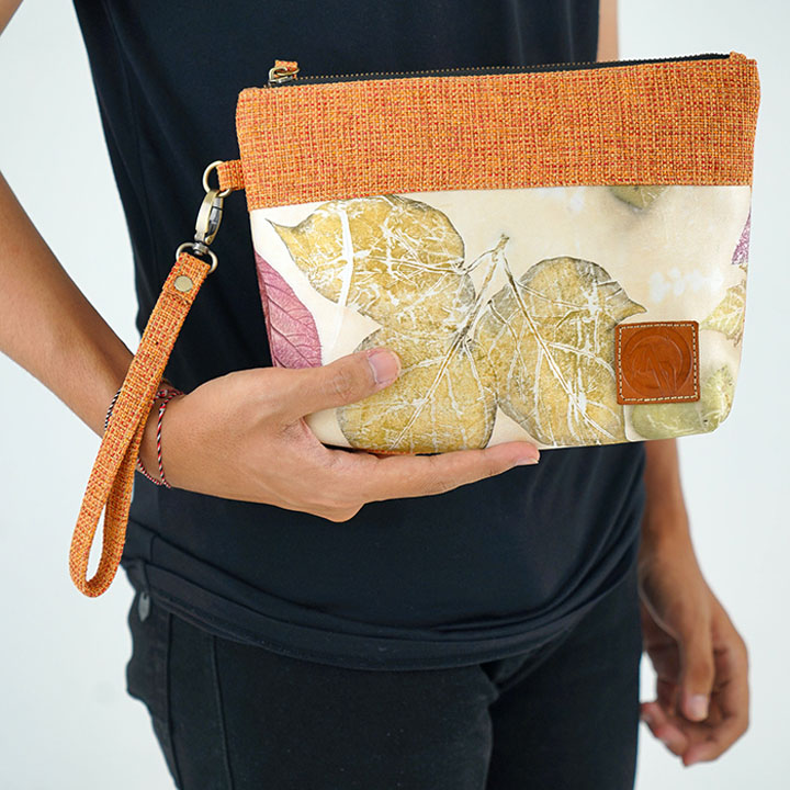 Pouch Ecoprint made of premium jute denim/silk mix fabric. Its products print natural motifs (leaves, flowers and natural dyes) called eco prints. The work is done on fabric, using this product is expected to support green life by reducing synthetic dyes that produce harmful pollutants to our earth. However, you can still look fashionable by using this product while protecting the earth.