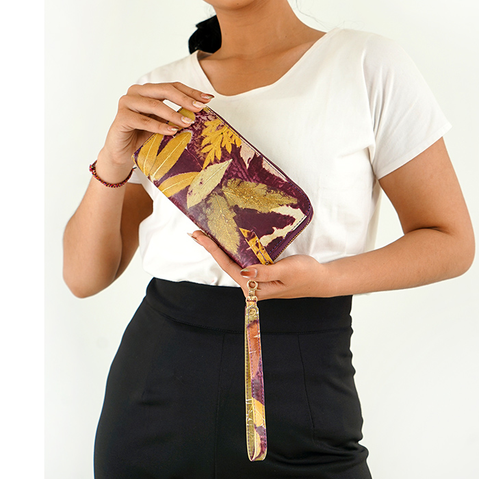 Leather Wallet Ecoprint made of leather with ecoprint motif. Its products print natural motifs (leaves, flowers and natural dyes) called eco prints. The work is done on leather that has been processed, using this product is expected to support green life by reducing synthetic dyes that produce harmful pollutants to our earth. However, you can still look fashionable by using this product while protecting the earth.