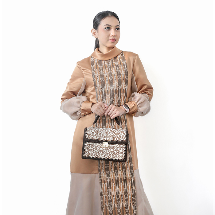 This knitting bag consists of front and back sides made from Sambas Songket woven fabric with a combination of bamboo slices as a substitute for gold thread and then coated with evo foam then knitted around it. The left, right and base sides are made from knitted sheets and then combined into a knitting bag and equipped with a handle which is also made from Sidan woven fabric which is knitted.