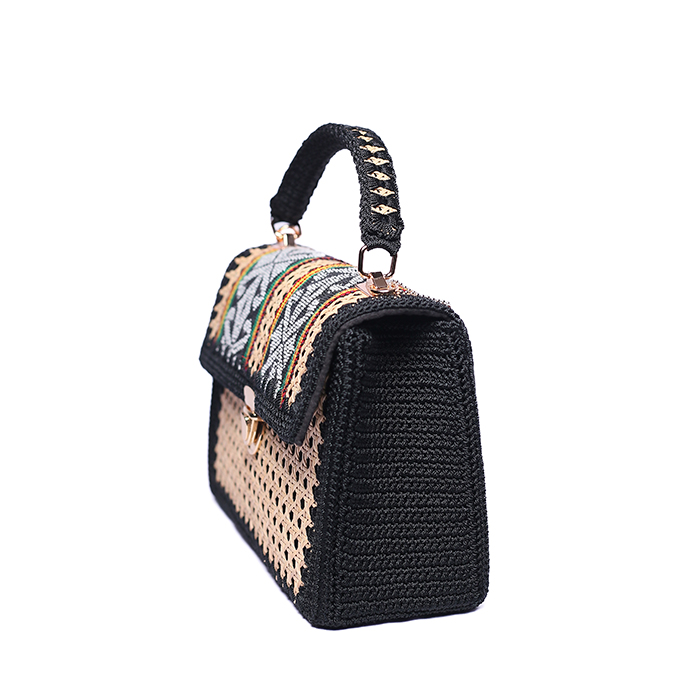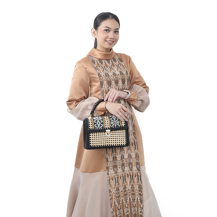 This rattan knitting bag consists of front and back sides made from woven rattan combined with Dayak Sintang woven scarves, then knitted around it. The left, right and base sides are made from knitted sheets and then combined into a knitting bag and equipped with a handle which is also made from woven rattan which is knitted.