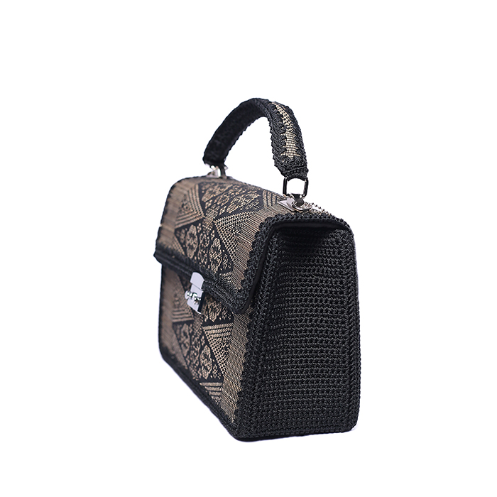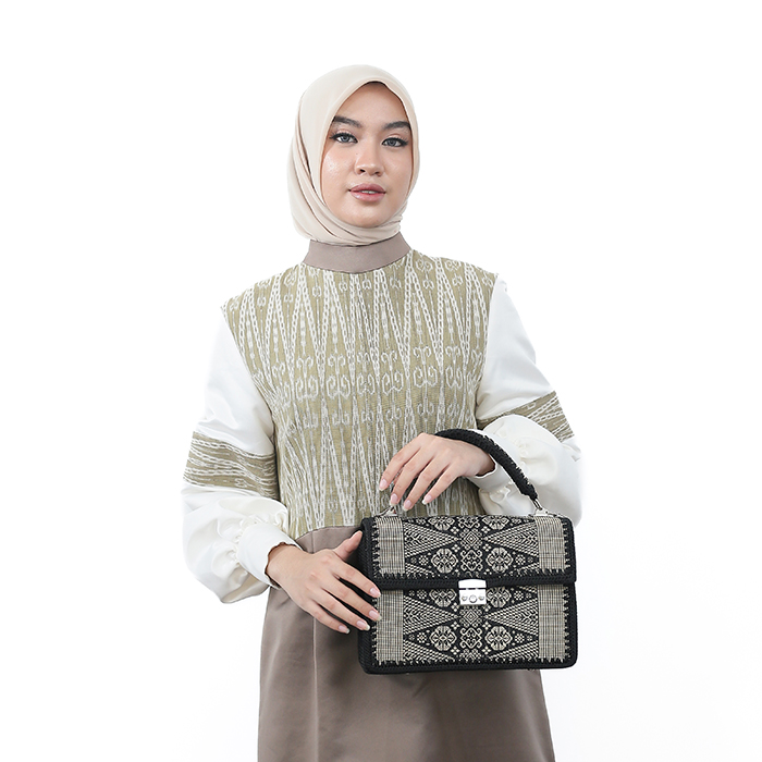 This knitting bag consists of front and back sides made from Sambas Songket woven fabric combined with bamboo slices as a substitute for gold thread and then covered with evo foam then knitted around it. The left, right and base sides are made from knitted sheets and then combined into a knitting bag and equipped with handles which are also made from bamboo Songket woven fabric which is knitted.