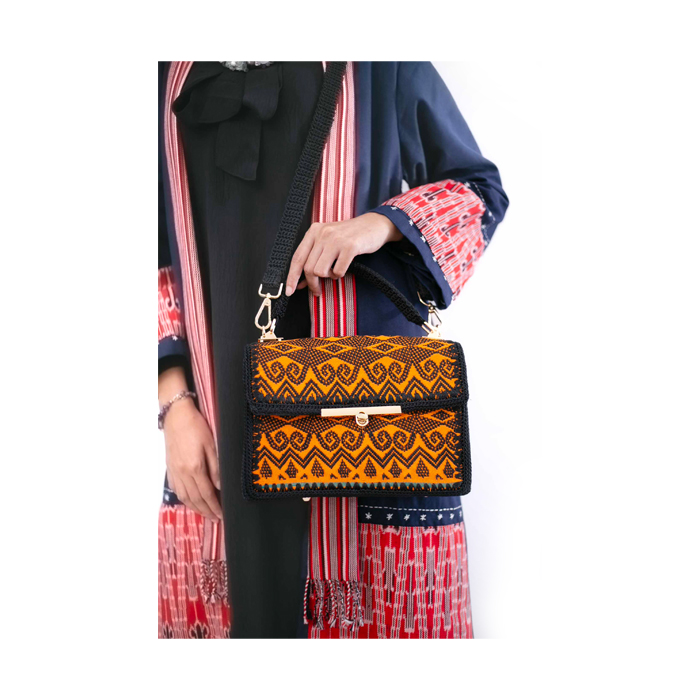 Material Type: Benang rajut nilon merek Peniti, kain tenun ikat Dayak Sidan.