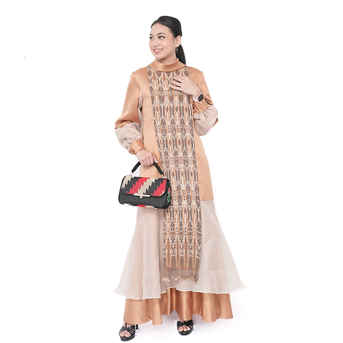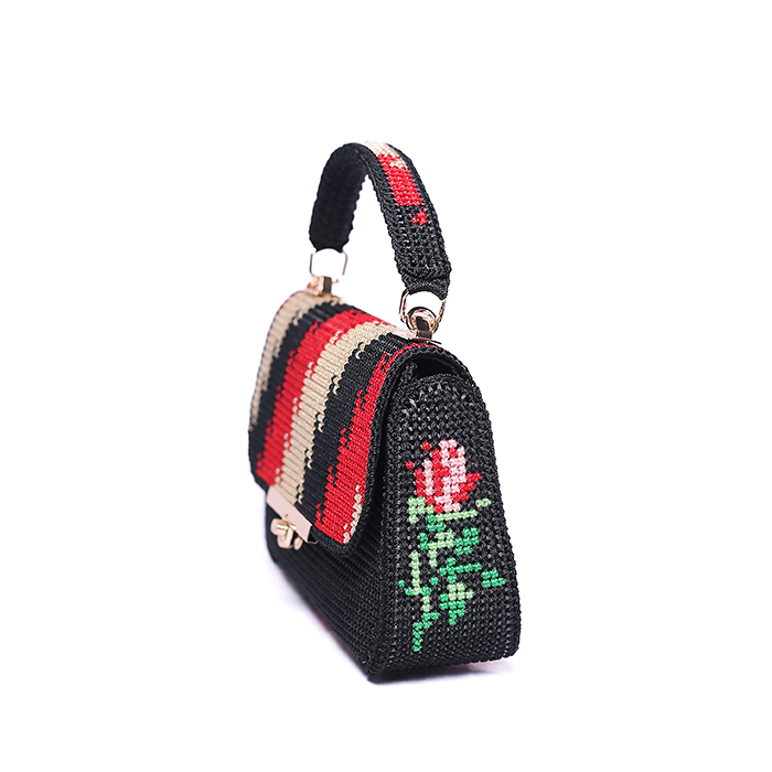 This Kristik bag is made from a square grid plastic mesh sheet that is already in the shape of a bag, where after finishing embroidering the kristik with the gill pattern motif, it is just folded according to its shape.