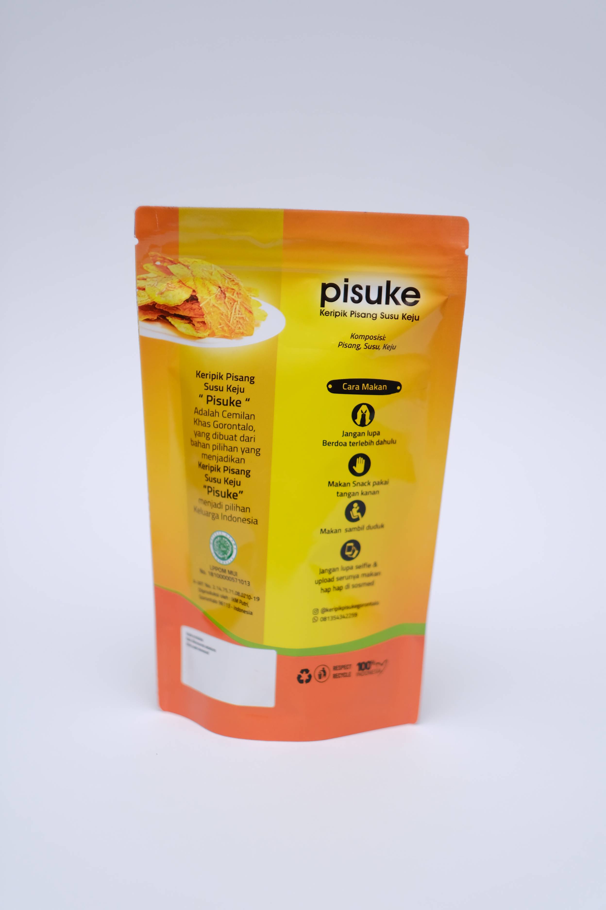 Keripik Pisang Susu Keju atau PISUKE adalah cemilan khas dari Gorontalo yang dibuat dari bahan baku lokal yang banyak dijumpai di Gorontalo yaitu pisang tanduk. Pisang berkualitas diberikan toping susu dan keju kemudian di panggang hingga garing. Produk Pisuke tidak akan di jumpai di daerah lain karena pisuke adalah hasil inovasi UMKM