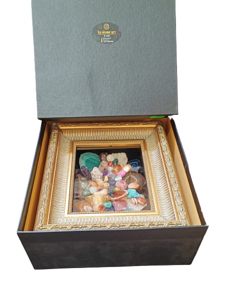 A mixture of various kinds of gemstones that are abstractly arranged and packaged in a frame that is used to beautify the house as a display.