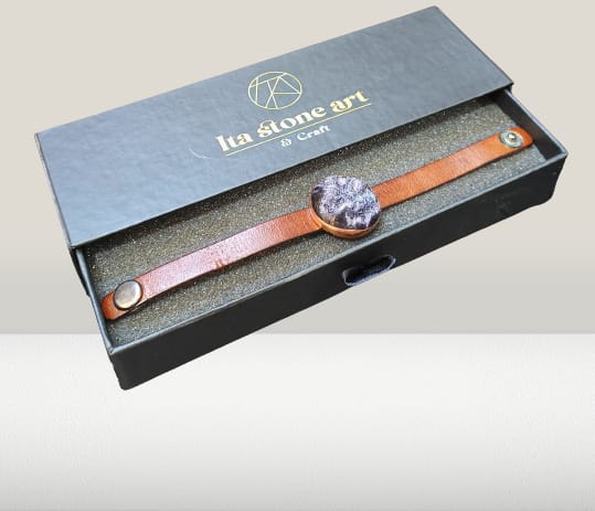 A mix of Druzy quartz and genuine cow leather. Druzy quartz stones are believed to help improve concentration and memory as well as stimulate blood circulation.