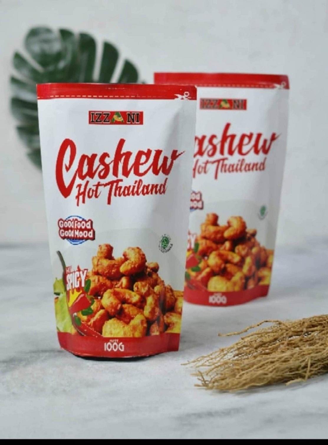 IZZANI Kacang Mede Cashew hot Thailand [ 100g ] Merupakan Kacang Mede Kualitas Super, dipadu dengan Bumbu Bawang Putih, Garam, margarin, cabai segar, tepung beras dan daun limo . Sehingga memiliki cita rasa yang gurih, renyah, pedas dan wangi daun jeruk limo Produk di goreng kemudian dilakukan penirisan minyak dengan spinner untuk meminimalisir kandungan minyak setelah proses penggorengan selesai, Disortir ulang dan dipisahkan dari mede yang belah dan patah sehingga hanya mede yang utuh, bulat saja yang masuk kedalam kemasan.