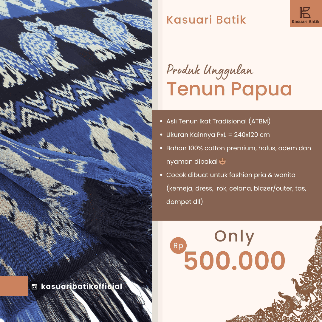 Pattern Meaning: Tenun ini menggambarkan keunikan Burung Kasuari yang merupakan icon Daerah Papua Barat. Selain itu, terdapat motif Tifa Papua yaitu alat musik tradisional Suku Papua yang menghiasi kain wastra ini.