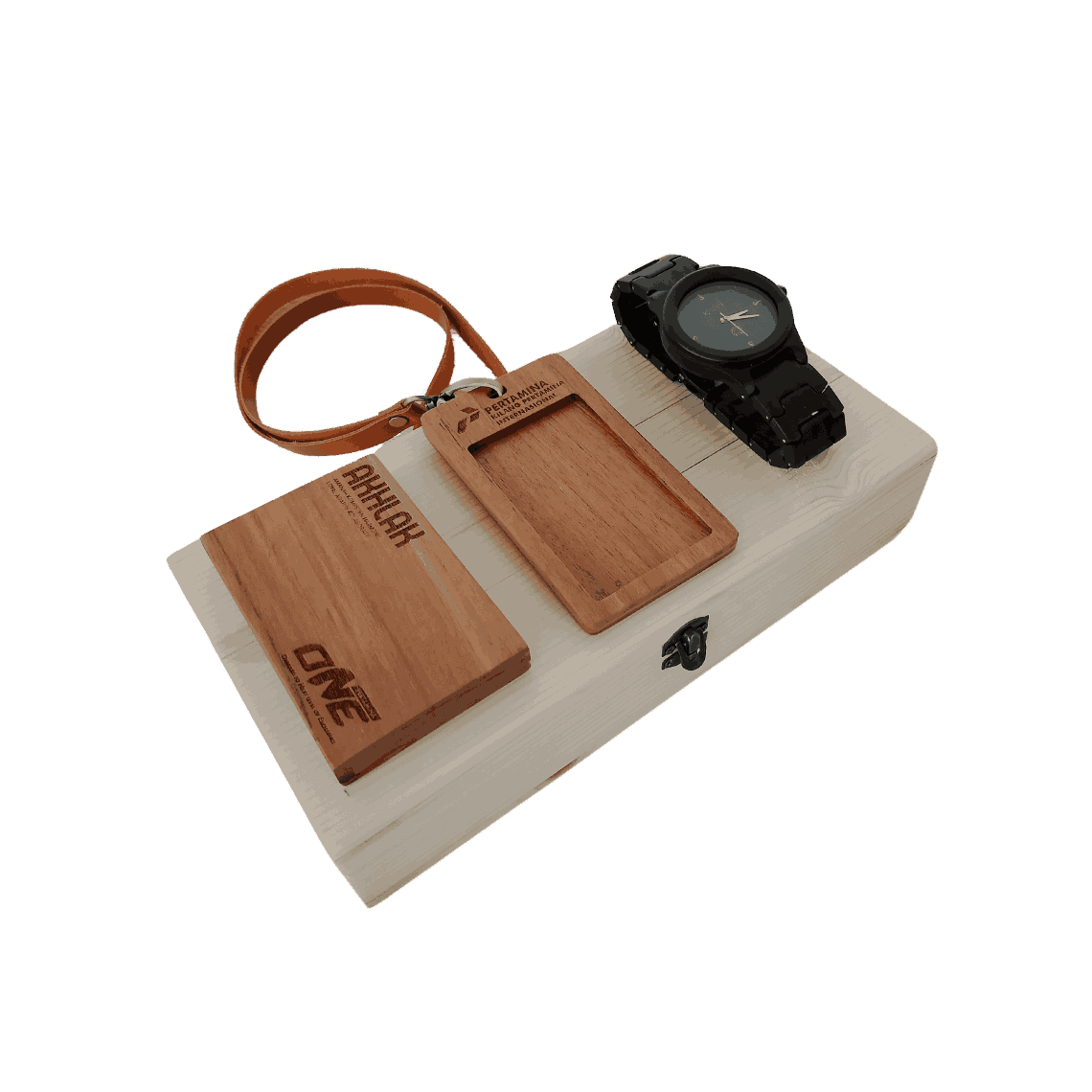 Paket bundling lanyard, box kartu nama dan jam tangan kayu Jethro Sono