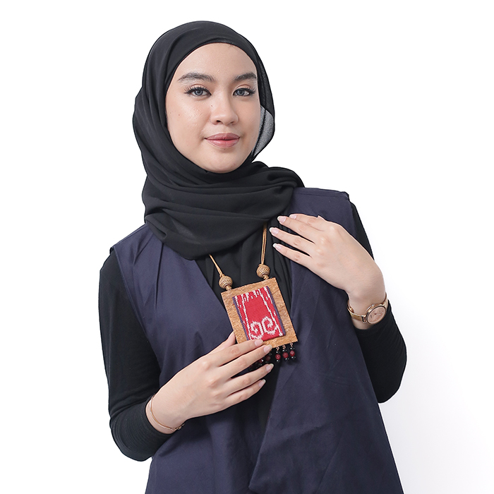 Material Type: Kulit kayu kapuak, kain tenun ikat Sintang, batu alam bulat, mote, charm bakar dan tali kulit.