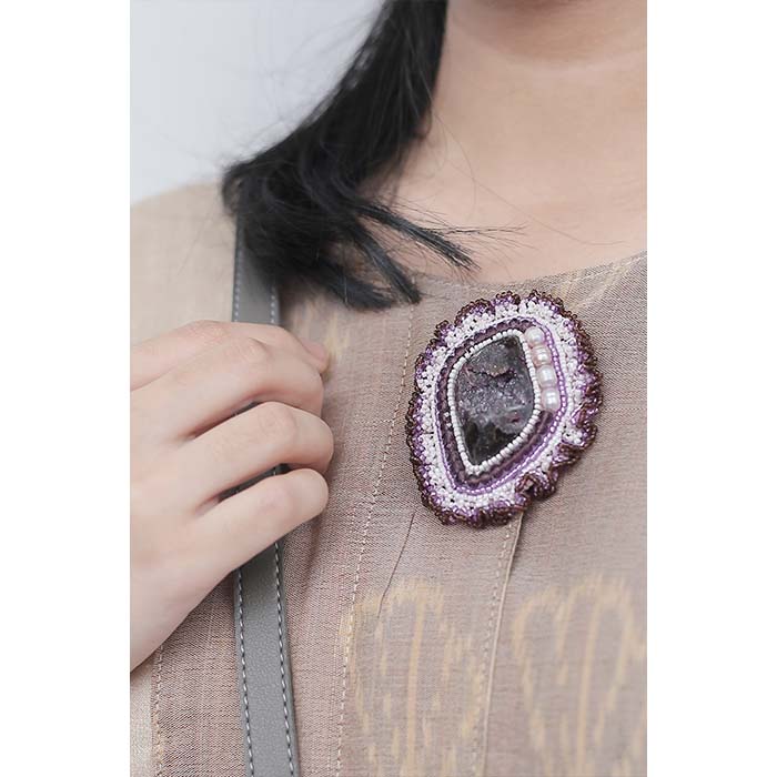 Druzy natural stone brooch, made with cabochon beadembroidery technique decorated with Japanese sequins, freshwater pearls, and crystals sewn 1 by 1 with special beading thread sono thread, finished with thick synthetic leather and safety pin.