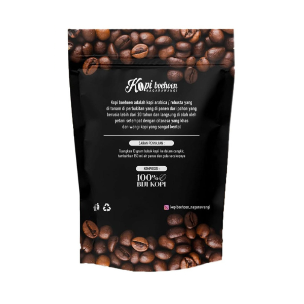Boehoen coffee is arabica and robusta coffee that is grown on the hills of Mount Manglayang from trees that are more than 20 years old and directly processed by local farmers with a distinctive taste and a very thick coffee fragrance.