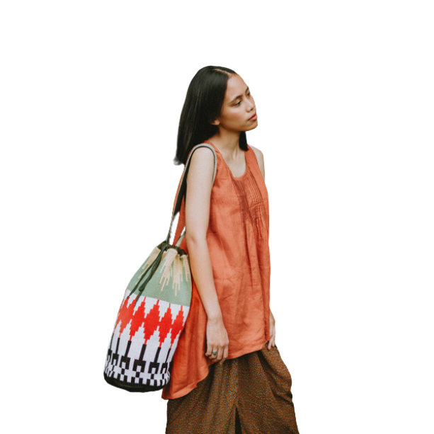 A knitted bag with an ethnic yet modern design, perfect for complementing any outfit, it also has enough space to carry the wearer's essentials.