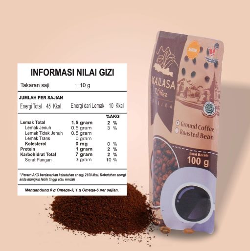 Kailasa coffee is coffee with geographical indications Arabica Coffee Dieng Mountain, Banjarnegara. Planted at an altitude of 1,200 Mdpl with a majority of varieties Lini S 795. Planting sites are located on the mountainside of the Bismo Hill, which includes the highland area of the Dieng. Processed with a variety of proper coffee beans processing, It has a distinctive scent, with a good taste, as well as variants in the processing process will create a typical Nusantara coffee. Raw materials cherry red coffee, selected premium bean, specialty coffee, fresh roast, standart profile roasting light to medium, medium to fine standart grinding, 100 % Arabica coffee, pure and natural, guaranteed, PIRT and Halal Certified, listed on DJKI.