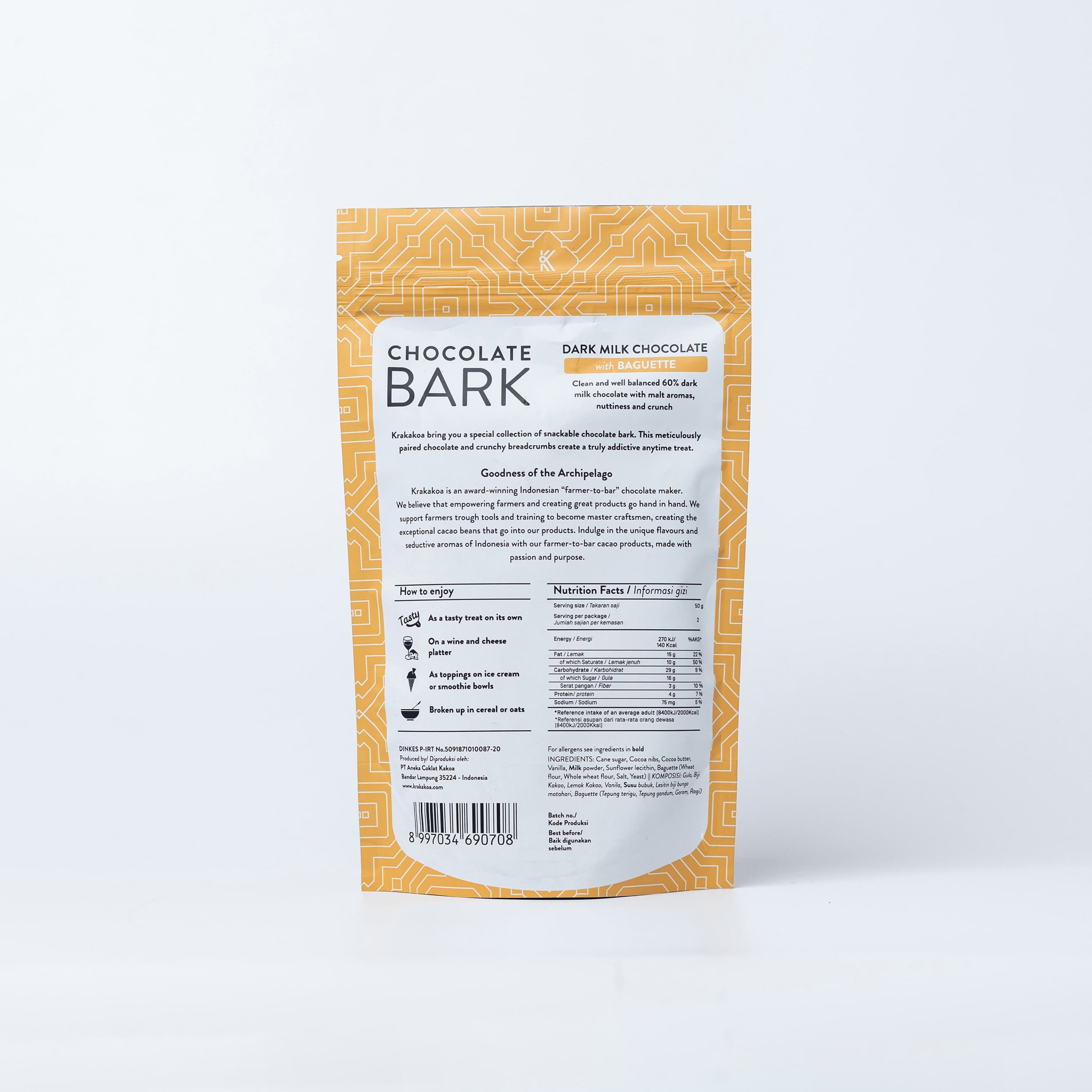 This special collection of snackable chocolate bark combining handcrafted Baguette bread with dark milk chocolate. This meticulously paired chocolate and crunchy breadcrumbs create a truly addictive anytime treat.