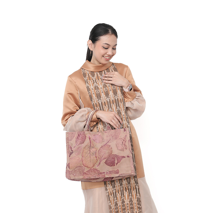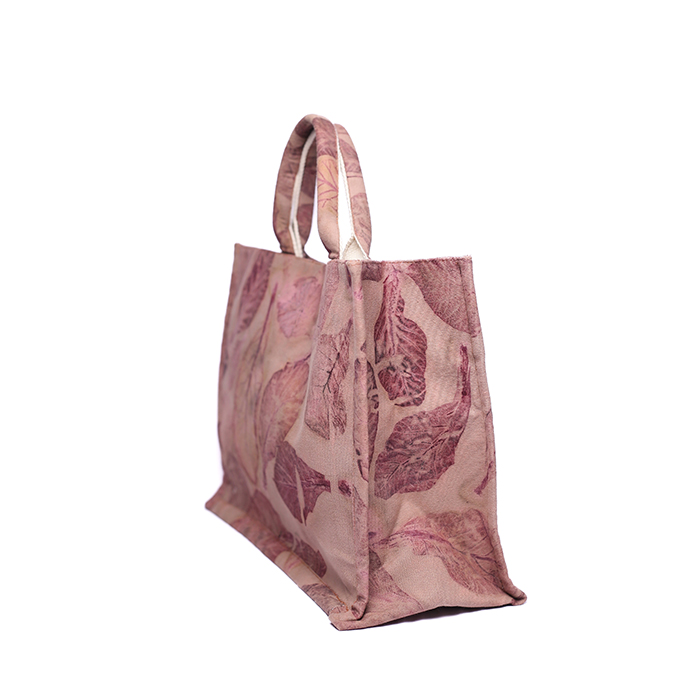 This large tote bag is perfect for formal and non-formal occasions. Made of canvas with ecoprint technique that produces abstract leaf motifs.